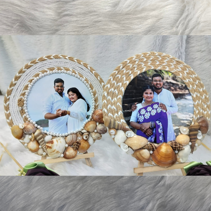 Get a charming Couple Pack of 2 Circular Sea Shell Photo Frames (8-inch each) with natural sea shells, pearls, and rope detailing. Includes wooden stands for easy display. Perfect for gifting. Photos not included.