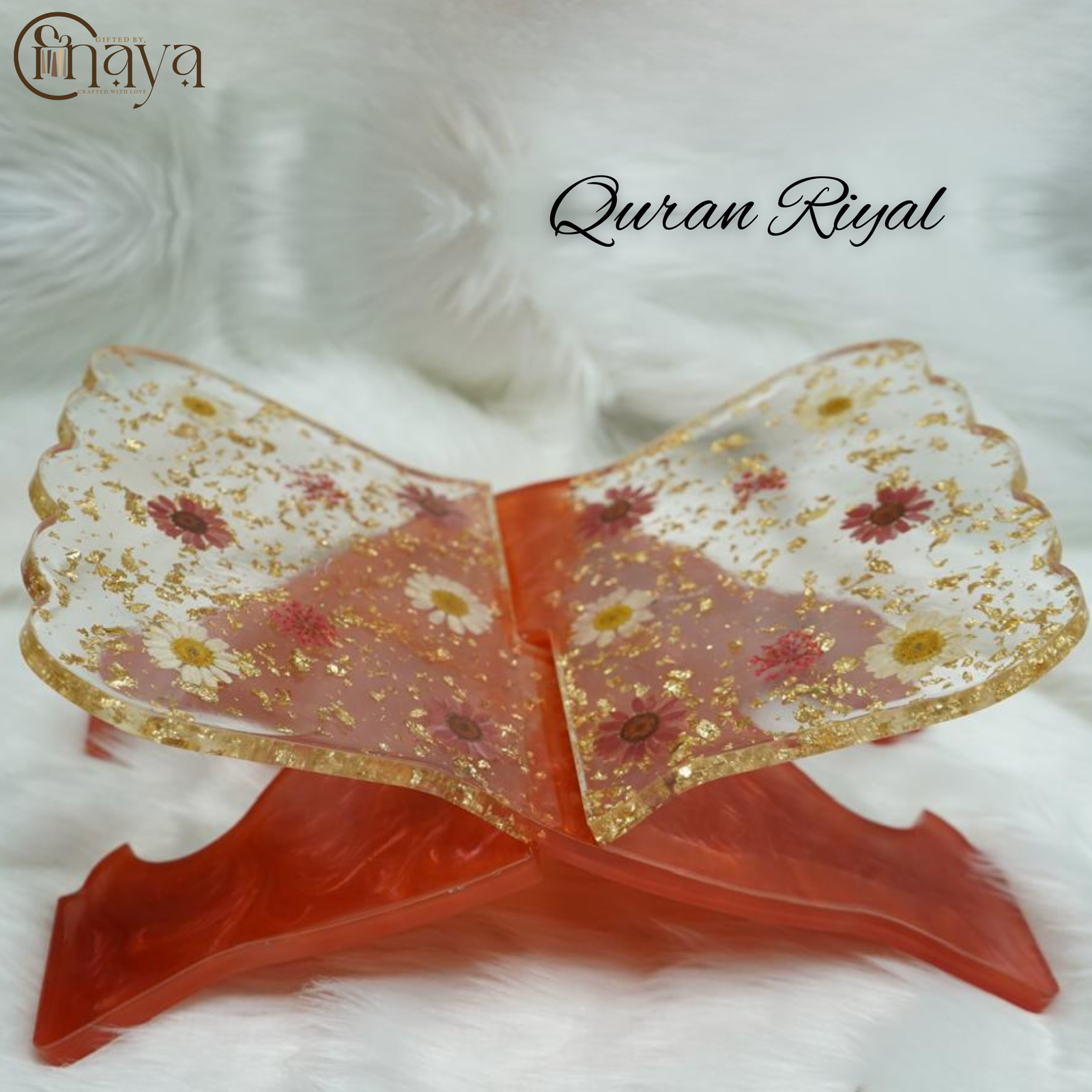 Handmade resin riyal with real dried flowers and gold foil finish.