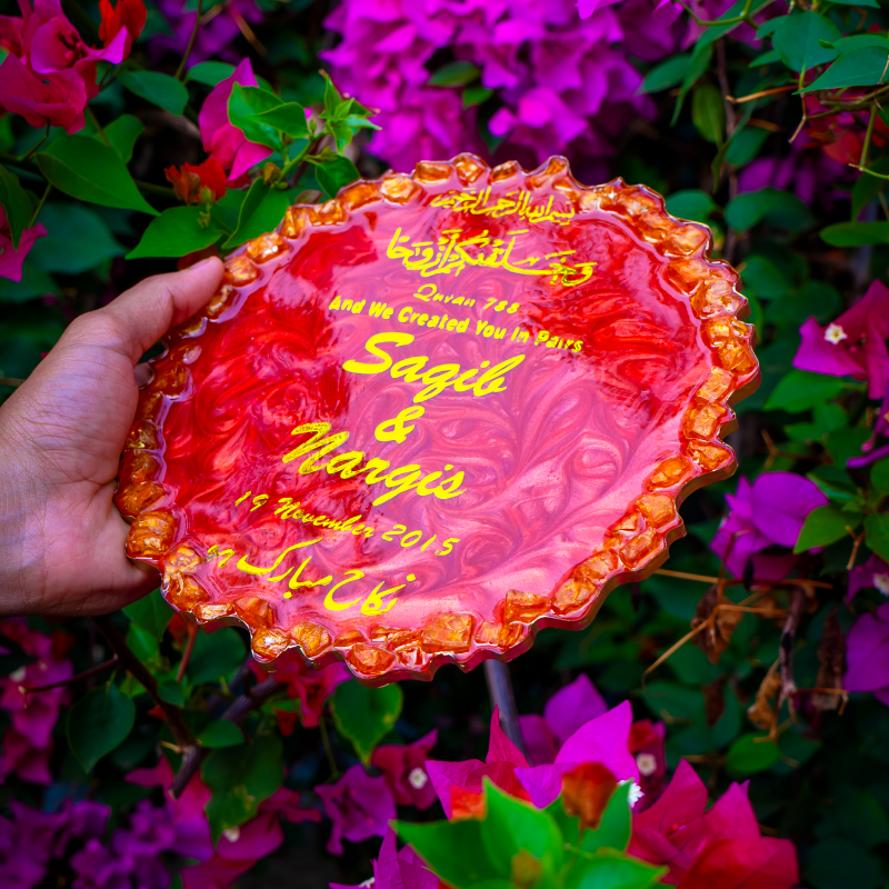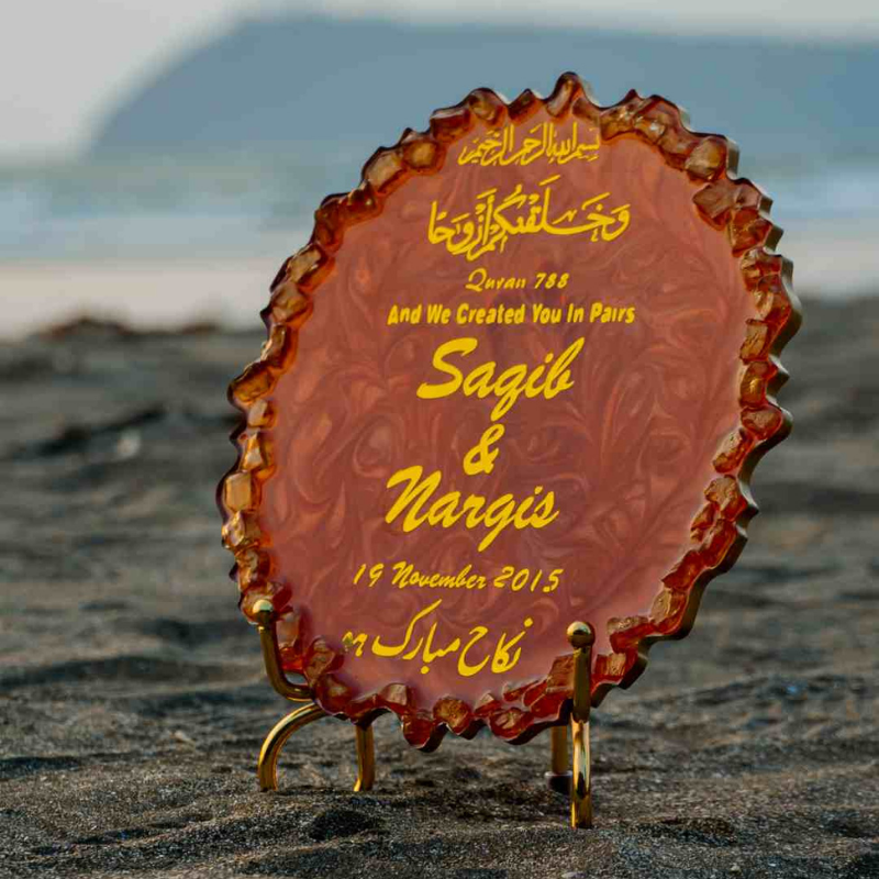 A personalized 8-inch resin plaque featuring Islamic verses and couple names — perfect for nikkah, weddings, or anniversary gifts.