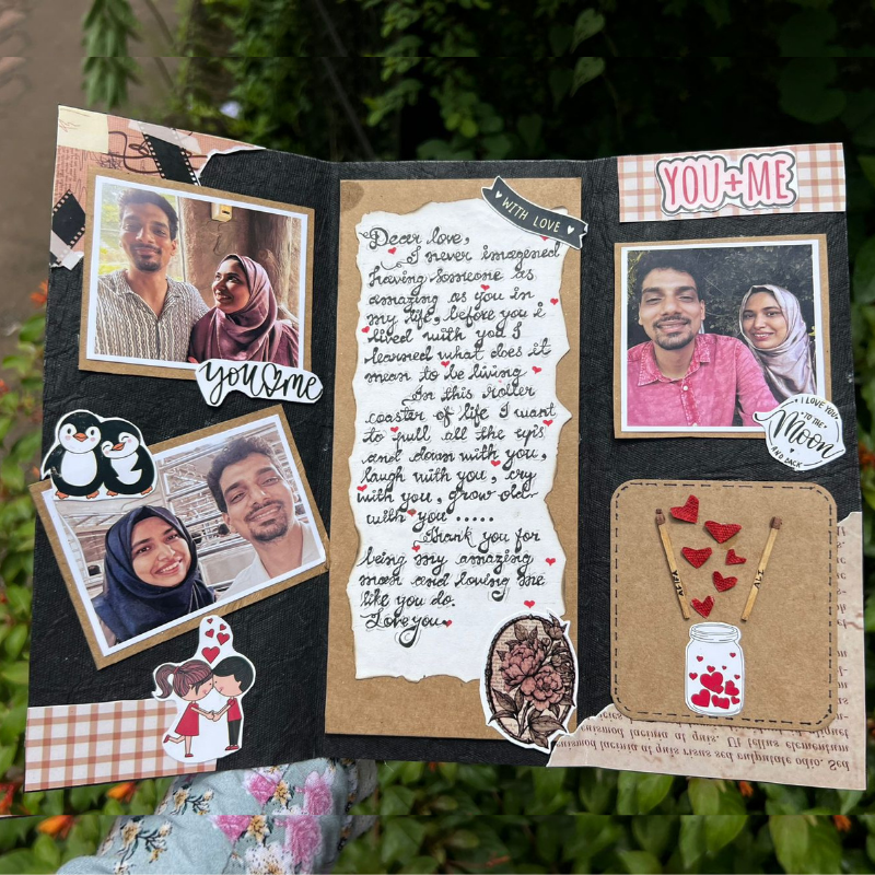 Celebrate your love story with this handcrafted, personalized scrapbook card featuring heartfelt messages, photo frames, 3D stickers, and romantic décor. A perfect gift for anniversaries, birthdays, or just because!