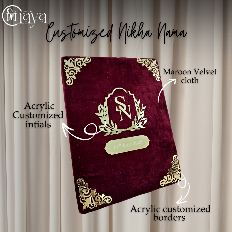 Elegant 10×12.8 inch Nikah Nama wrapped in maroon velvet, adorned with golden acrylic customized initials, borders, and nameplate — a perfect keepsake for your special day.