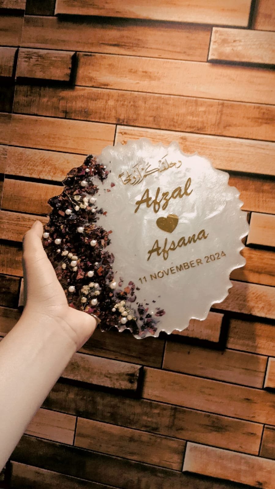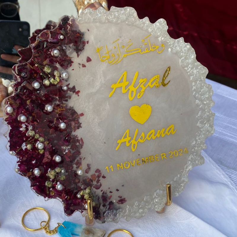 Custom Islamic resin plate with names, nikah/engagement date, and Arabic calligraphy. Decorated with dried flowers and pearls—perfect as a wedding keepsake or wall/table display.