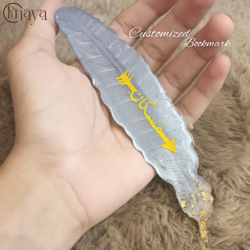 A handcrafted resin bookmark shaped like a leaf, featuring name customization, gold flakes, and a ribbon tip – perfect for book lovers, students, and gifting.