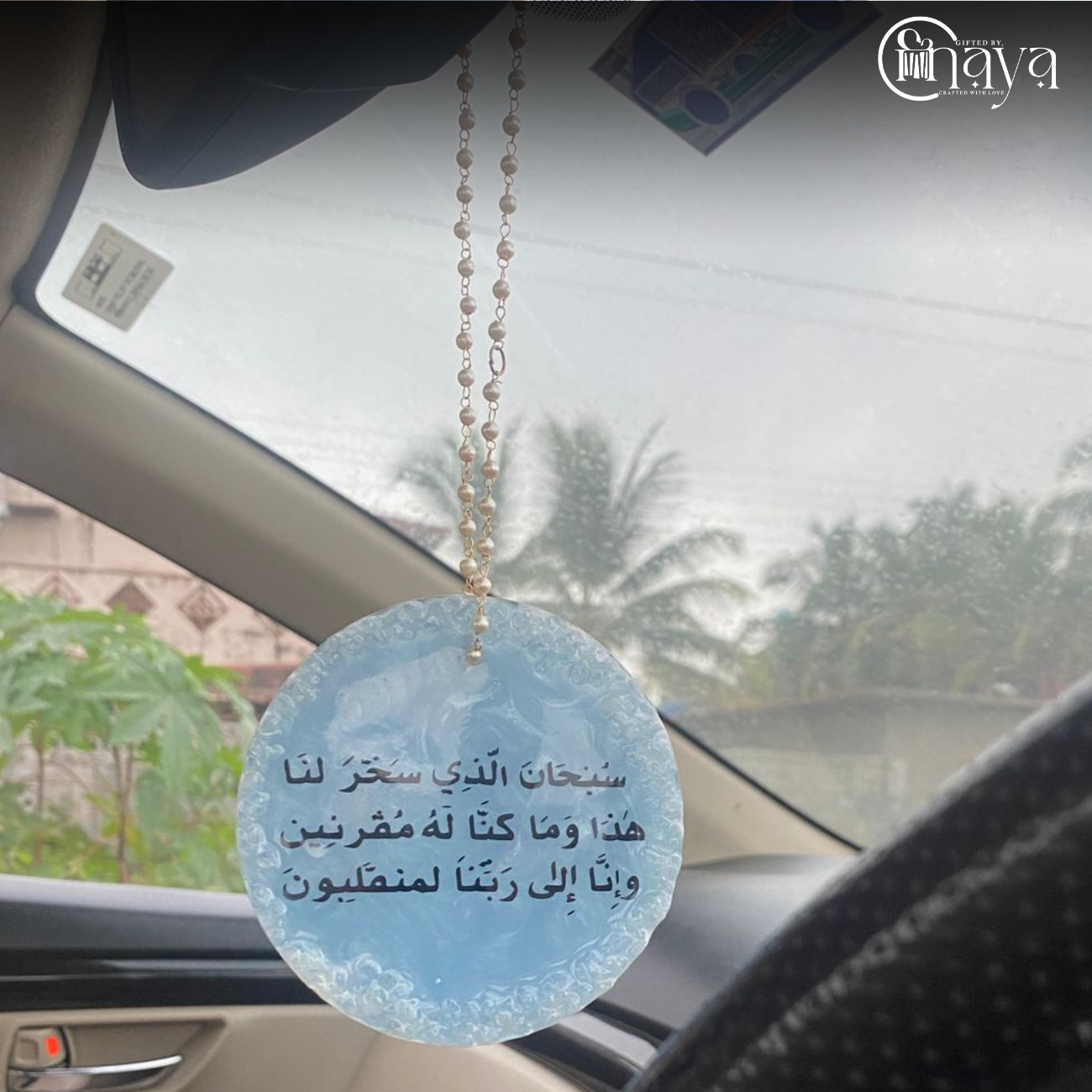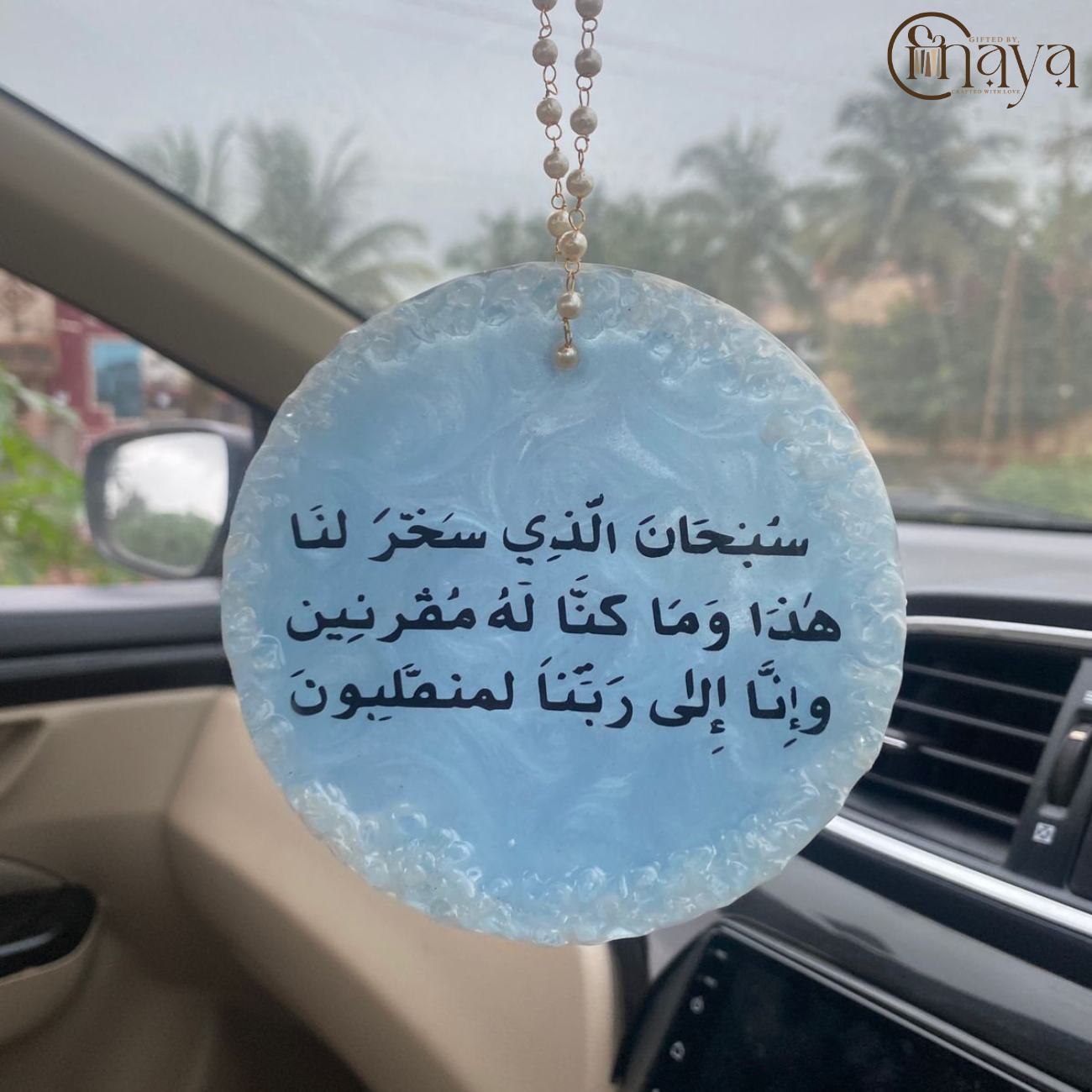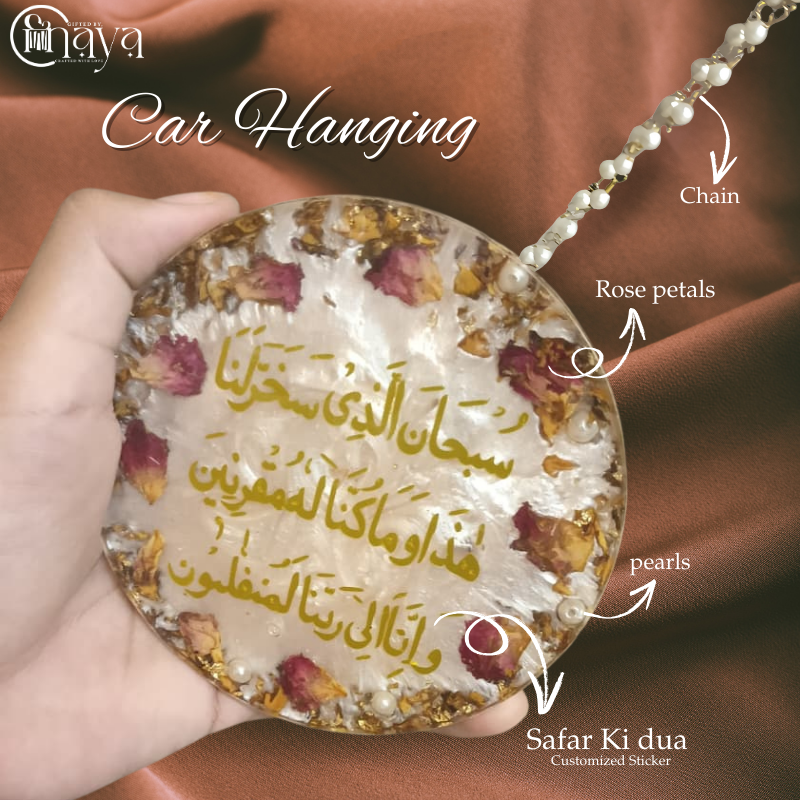 Beautiful handcrafted 4-inch resin car hanging with real rose petals, pearls, and customized sticker of Safar Ki Dua. Comes with a delicate pearl chain for a unique and elegant look.