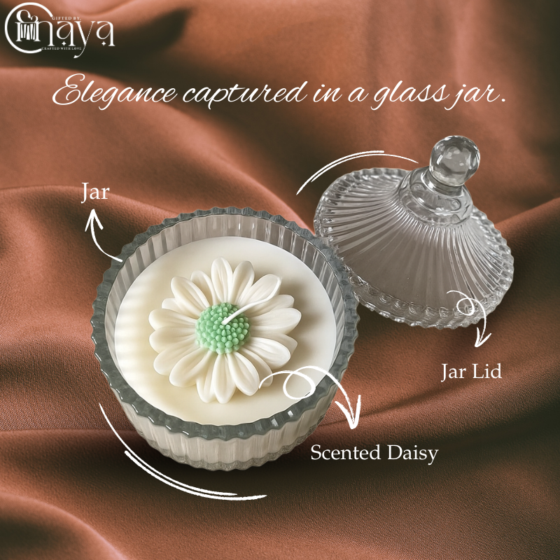 ✨ Elevate your space with our Scented Daisy Glass Jar Candle – a perfect blend of elegance and fragrance. Hand-poured in a ribbed glass jar with a delicate floral design, this candle fills your room with a refreshing aroma while doubling as a chic décor piece. Ideal for gifting or creating a cozy ambience at home.